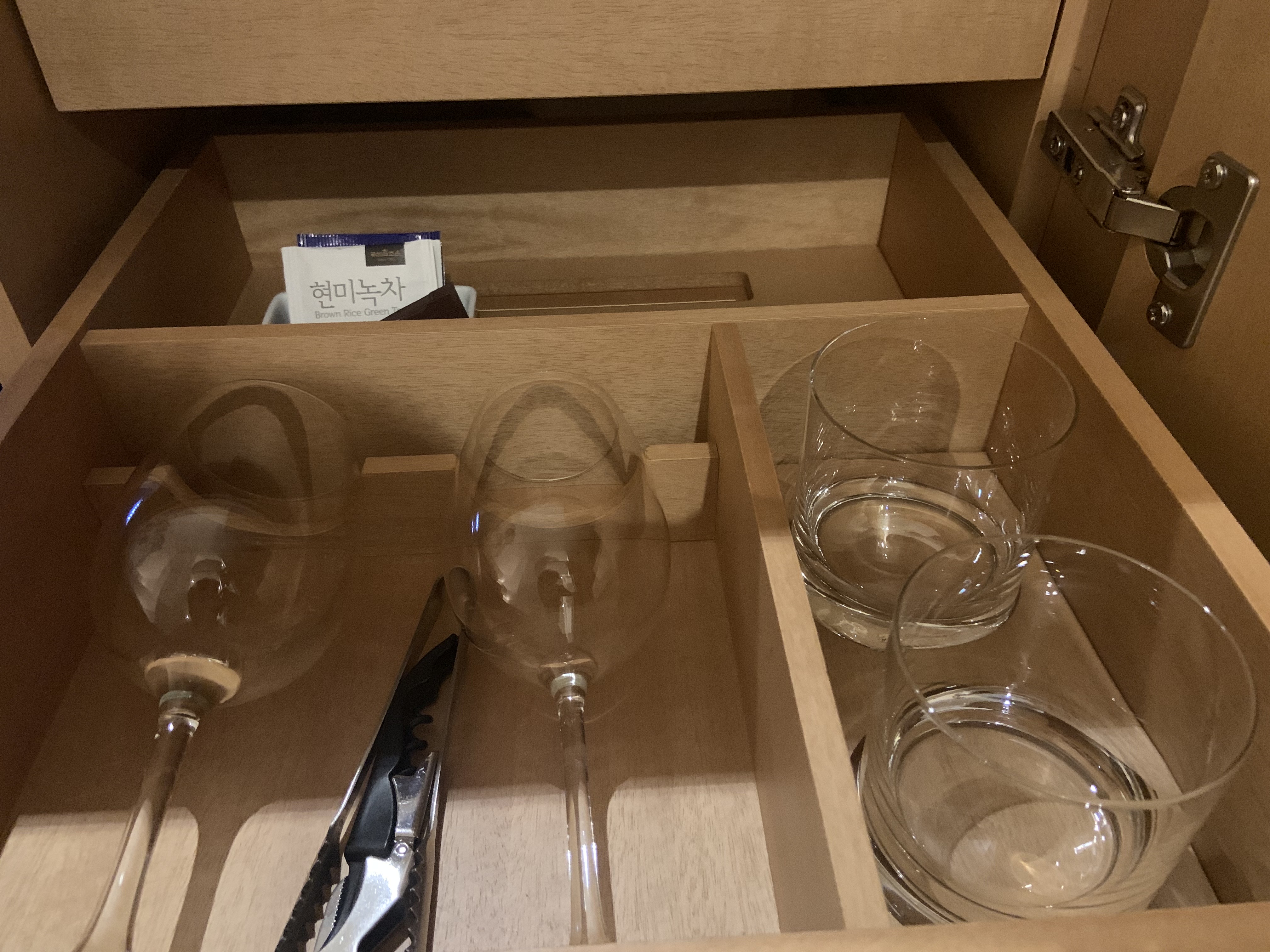 입구쪽 서랍에는 와인 오프너, 컵, 와인잔이 있었고