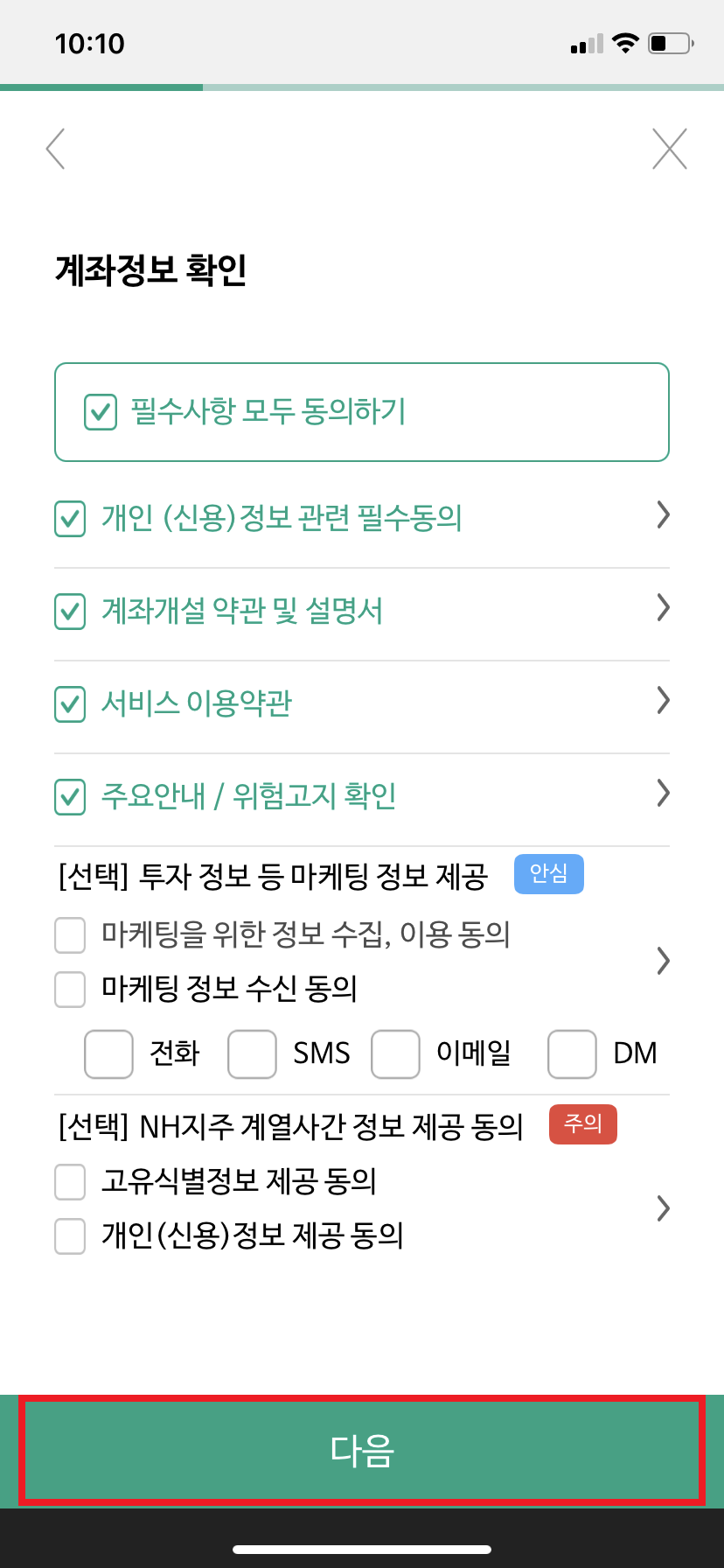 8. 다음으로는 계좌정보 확인을 하셔야하는데요, 필수사항 모두 동의하시고 다음을 클릭해주세요.