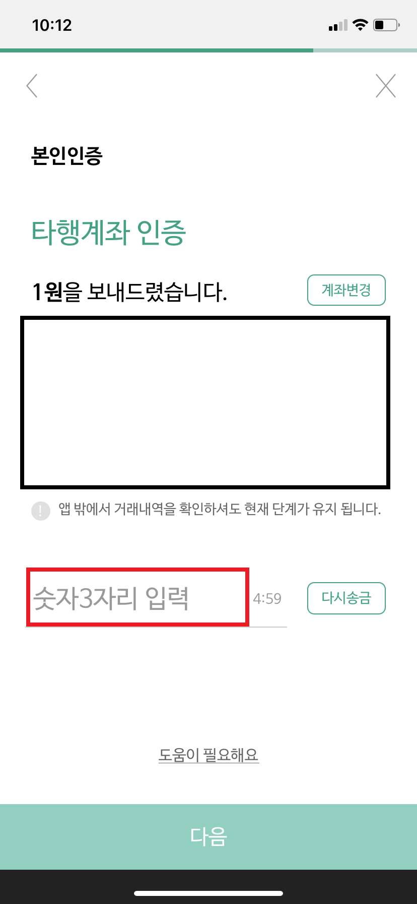 18. 그리고 나면, 타행 계좌 인증을 해주시면 됩니다. 본인 명의 계좌에 1원 송금과 함께 숫자 3자리를 확인할 수 있는데요. 이 숫자를 입력해주시면 됩니다.