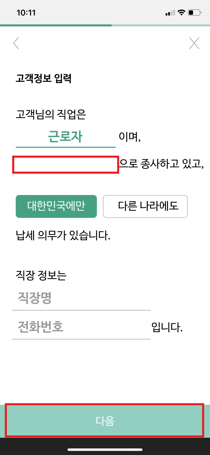 그리고 나서 근로자시라면 직장명과 직장 전화번호를 입력해주시면 됩니다. (참고로 대충 입력해도 넘어가집니다!)