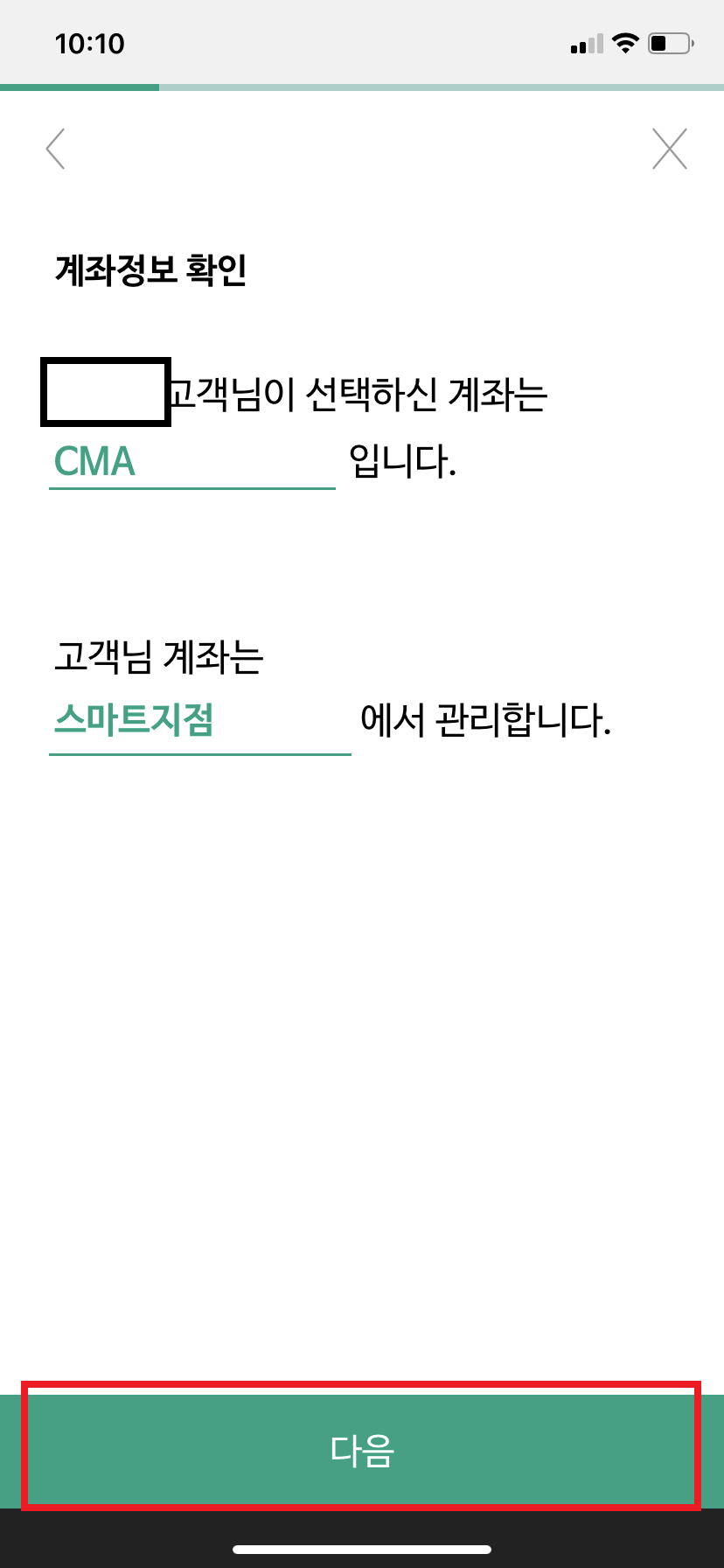 7. 선택한 계좌가 CMA임을 알려주고 스마트 지점임을 알려줍니다. 다음을 클릭